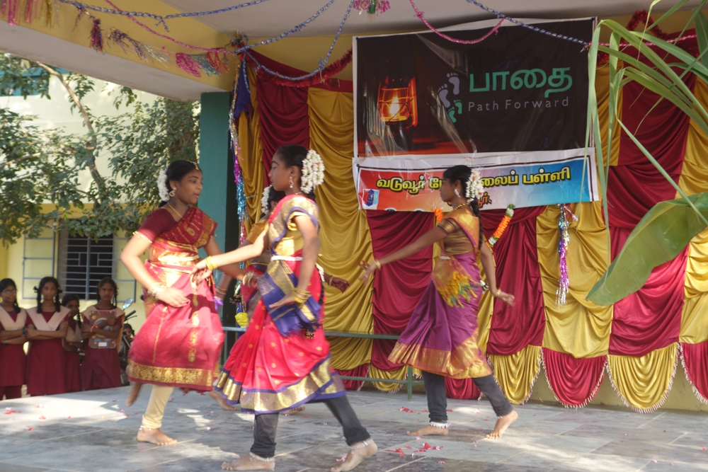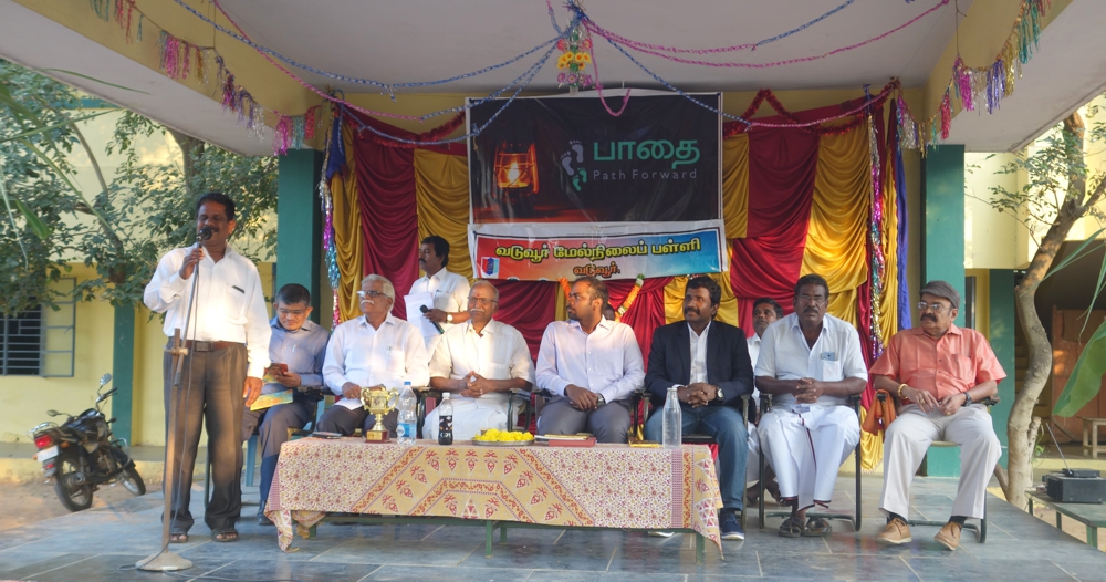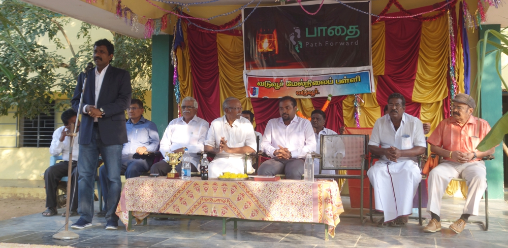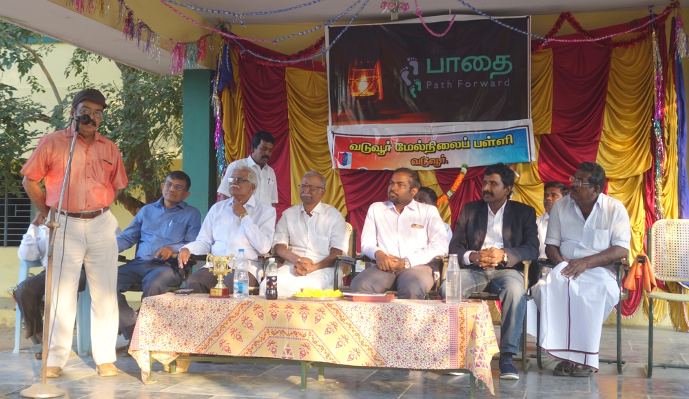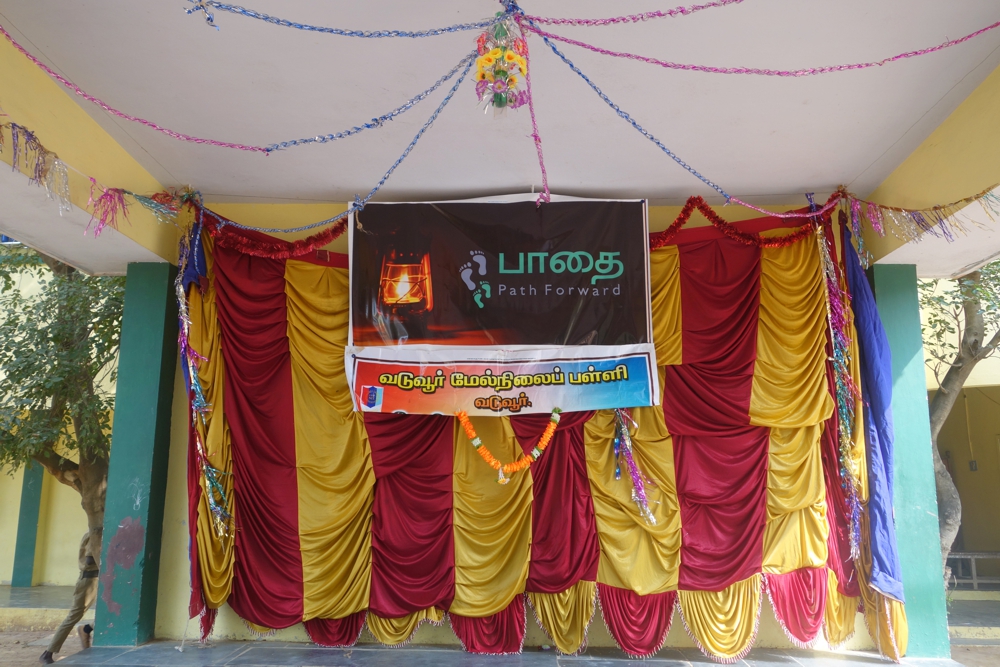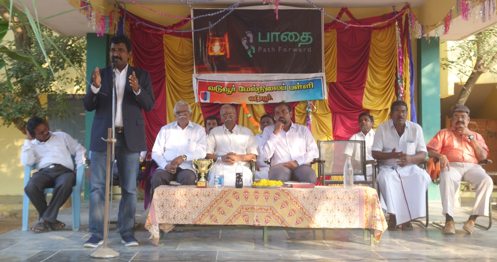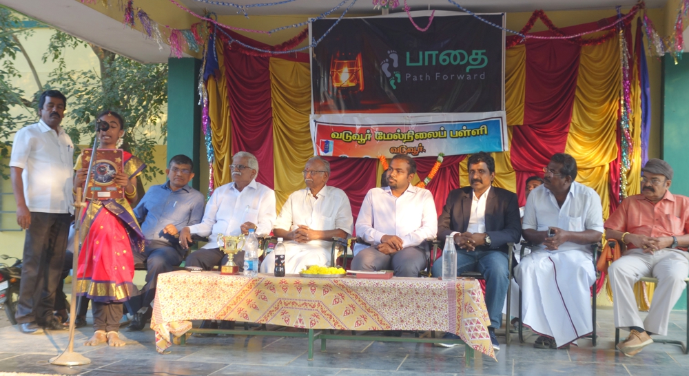 As a first project, Paathai Trust donated Rs 1,75,000 (Rupees one lakh seventy five thousand) worth of Library books to 16 Government schools in Vaduvur area (For High School =INR ~15,000 and Primary School= INR~7,500) in a function held in Vaduvur Government Higher Secondary school on January 5, 2018 using the funds collected from the sale/donations of our “Vettikkadu” and “Geetha Cafe” books.
