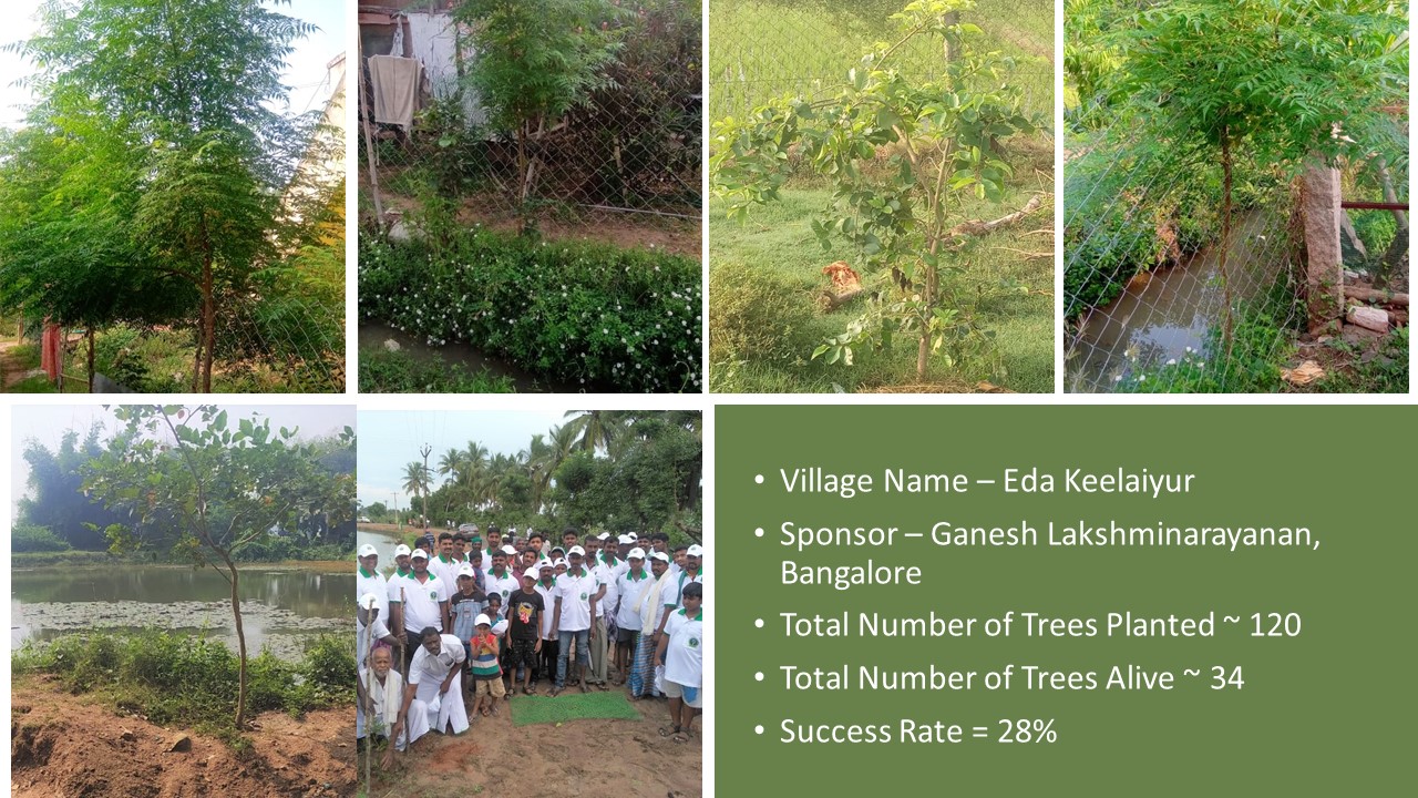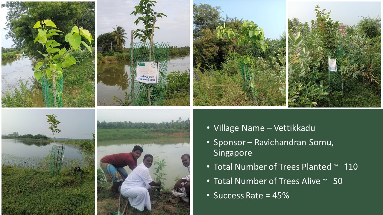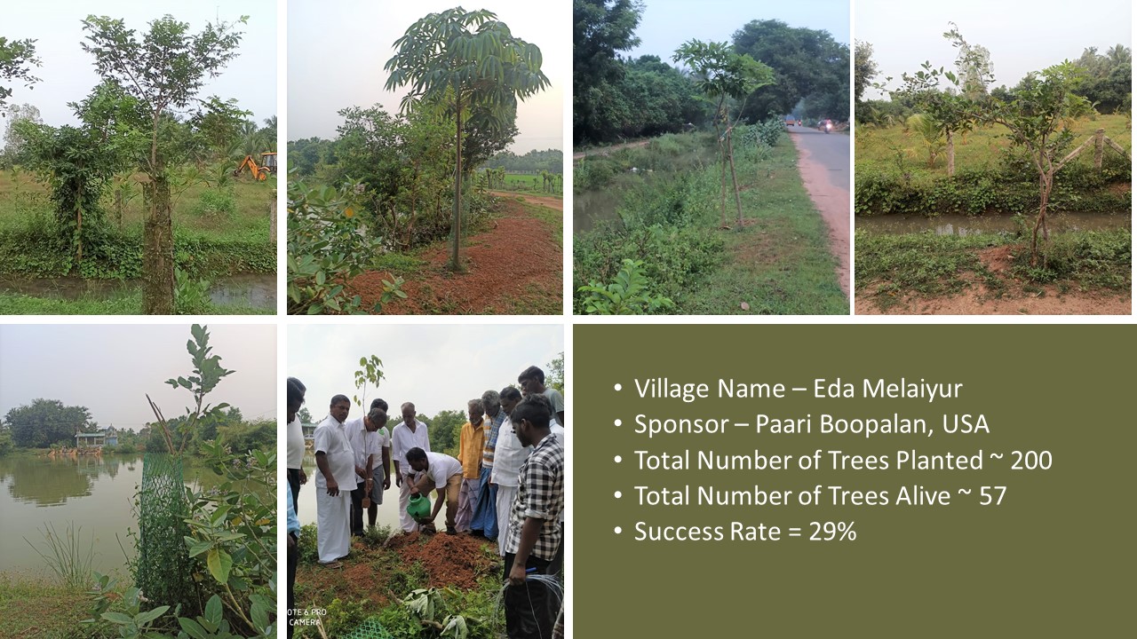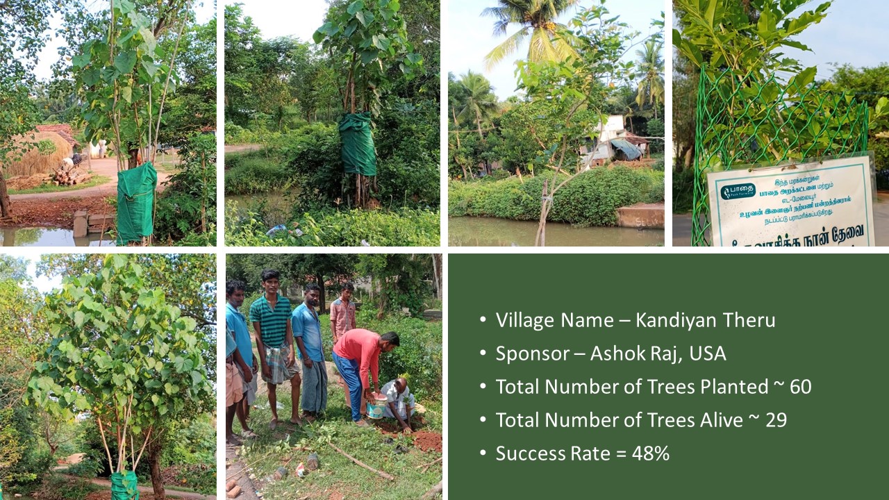 Last year Deepavali on 28-10-2019, “Paathai” Trust in association with “Namadhu Kiramam” celebrated Green Deepavali by planting trees on the banks of the restored water bodies in 2019. We planted ~1560 Trees and on the first anniversary 28-10-2020, ~930 Trees are alive and growing well. I set a realistic target of 50% success rate for this project and very happy with the result of 60% success rate.