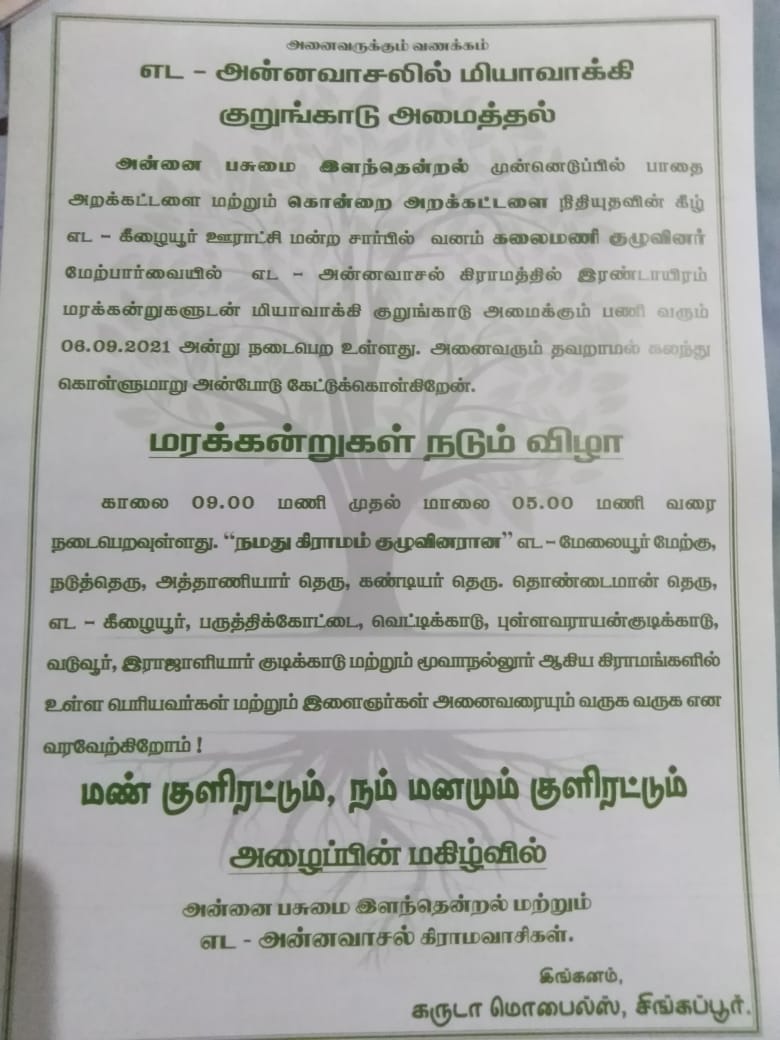 Eda Annavasal Miyawki Mini Forest – January 2022by Ravichandran SomuJanuary 31, 2022March 3, 2022 Paathai Trust’s 4.5 months old 2000+ trees Miyawaki Mini Forest in Eda Annavasal village. Leave a Reply Cancel replyYour email address will not be published. Required fields are marked *Name * Email * Website Comment * Save my name, email, and website in this browser for the next time I comment.